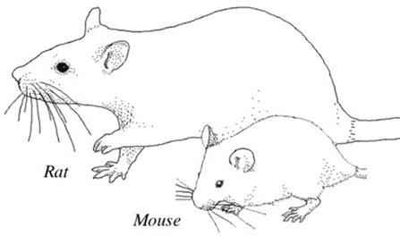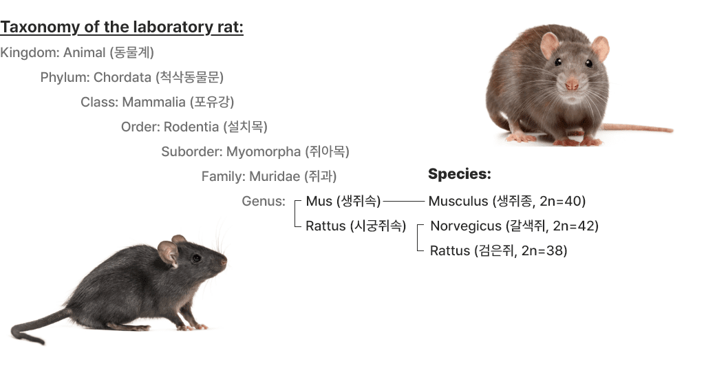 - 실험용 쥐는 시궁쥐 (Brown rat 또는 Norway rat) 이라 불리는 Rattus norvegicus의 가축화된 후손